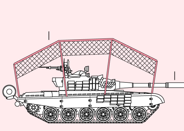 Tabiki bahsettiğim iki kamikaze drone saldırısını bertaraf etmesi o kadar da kötü değil. Tank bu sayede ufakta olsa bir avantaj elde ediyor. Gel gelelim bu zırhın en kötü yönüne. Tankın taretinin tüm hareket kabiliyeti yok oluyor. Akılla durgunluk veren bir karar bu. Yani tankı sıradan bi toptan veya obüsten ayıran en önemli noktalardan birini çöpe atmış oluyorsunuz. Ayrıca bu zırh oldukça ağır bu yüzden tankın hızınıda önemli ölçüde düşürüyor. Taraflar bu büyük sorunlardan dolayı daha hafif bir eklenti olarak balık ağı kullandı.