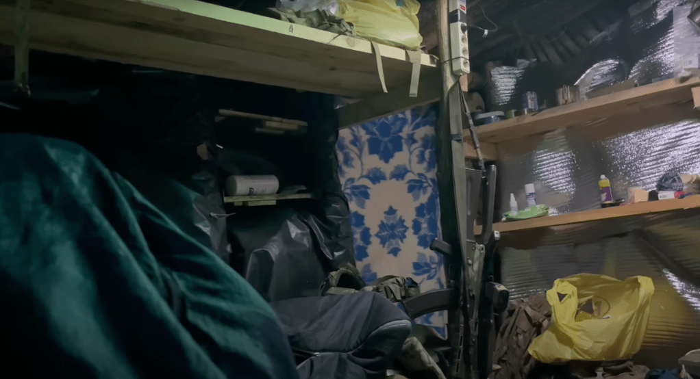 İrtibat hendekleri bu şekilde korunurken, sığınaklar çok daha rahat yöntemlerle korunabiliyor. Yapıları sayesinde zaten kamikaze droneların çok fazla hedefi olmayan sığınakların güvenliği genelde girişlerin zikzak çizen kısa bir tünel ve battaniye ile sağlanıyor. Evet, doğru duydunuz, battaniye. En az iki çivinin yardımıyla sığınağın girişine asılan kalın battaniye, kamikaze droneları engellediği gibi olası bir baskında içeriğin görünmesini ve el bombası gibi patlayıcı maddeleri de engeller. Aşağıdaki fotoğrafın tam ortasındaki mavi desenli battaniye, sığınağın girişini koruyor. Bölgedeki birkaç askere göre bu yöntem oldukça etkili, hatta havan ve topçu atışlarının sebep olduğu şarapnelleri durdurmak veya etkisini azaltmak gibi önemli yeteneklere sahip olduğunu da söylediler.